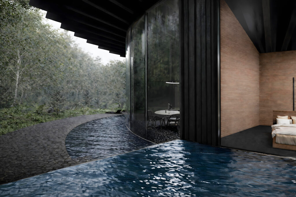 Sugi (japanische Zeder) bildet den materiellen und sinnlichen Kern der Architektur und entwickelt sich im Zusammenspiel von Licht, Feuchtigkeit und Zeit. Ein kreisförmiger Grundriss und ein von den umliegenden Bergen geformtes Dach erzeugen einen fließenden Innenraum, in dem Licht, Schatten und Ausblicke einen kontinuierlichen Dialog mit der Landschaft führen.