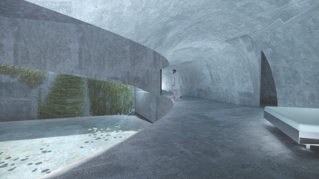 Im Zentrum des Projekts tritt Wasser als subtile Präsenz in Erscheinung – durch natürliche Kondensation gewonnen – und bietet einen Moment der Reflexion in der ariden Landschaft. Intimere Räume sind teilweise unterirdisch angelegt, während sich die gemeinschaftlichen Bereiche entlang der Achse entfalten, geprägt von kontrolliertem Licht und stillen Übergängen zum Horizont.